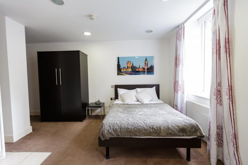 This is a double en-suite studio measuring around 19m². The room has a comfortable double bed, a desk area and private bathroom, as well as a wardrobe, as well as plenty of food storage space. The studio is fully equipped with a private kitchenette including a fridge. There is free Wi-Fi in each bedroom and throughout the building.